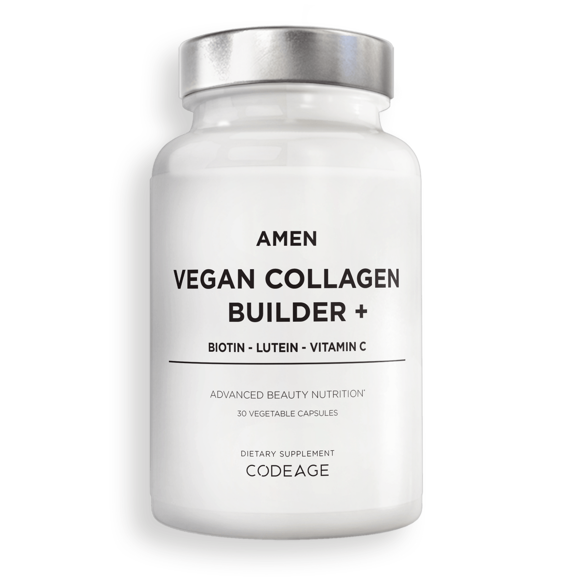 - Amen Vegan Collagen Builder+ offers an advanced blend of vitamin C, biotin, and lutein, all designed to help support your body's natural collagen production and promote overall well-being.* This formula is convenient to use with just 1 capsule a day.