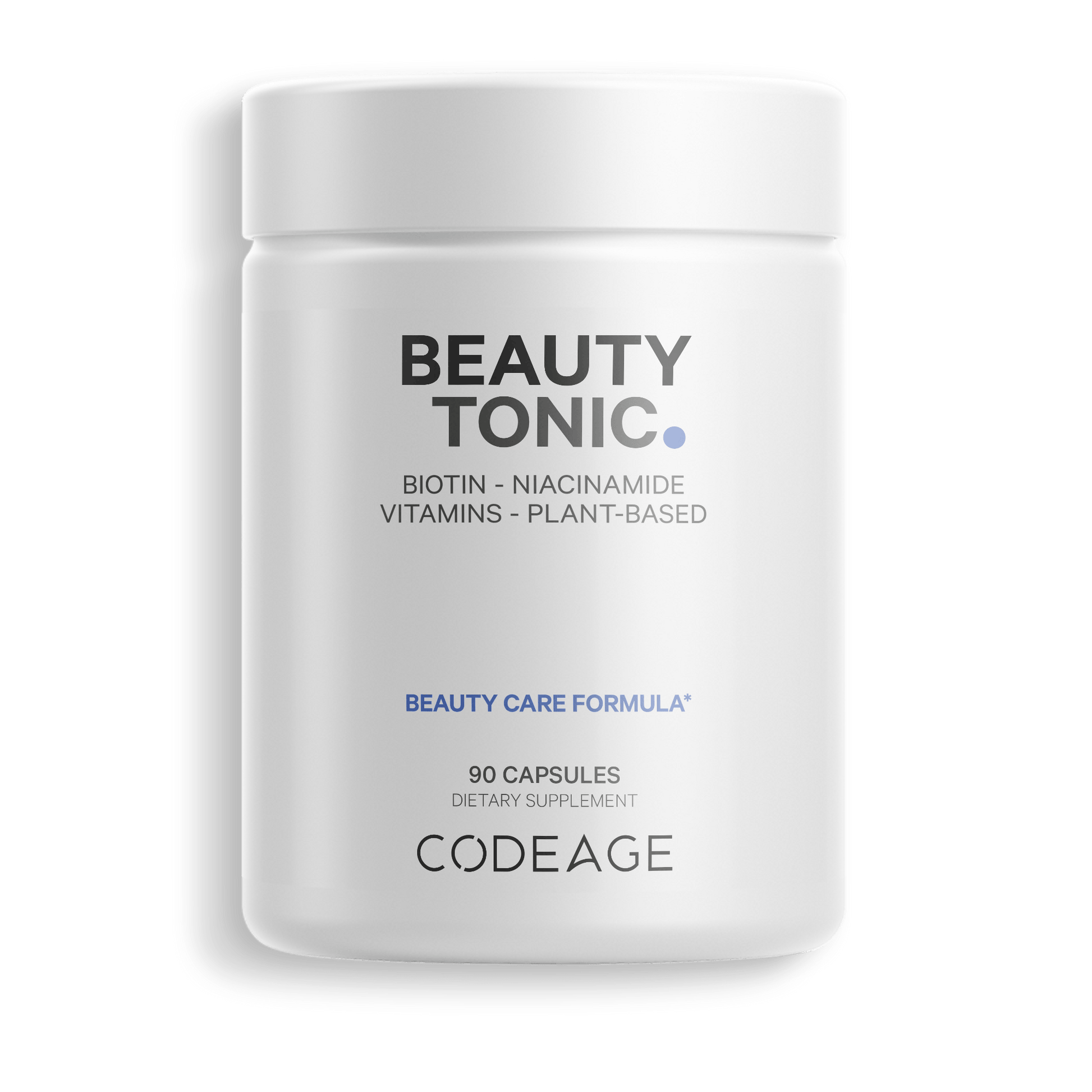 Codeage Beauty Tonic supplement offers a high dose of biotin, a blend of vitamin B complex, whole food vitamins C and E, phytoceramides, pantothenic acid, folate, minerals, organic astaxanthin, and an organic food blend to support overall beauty and wellness.*