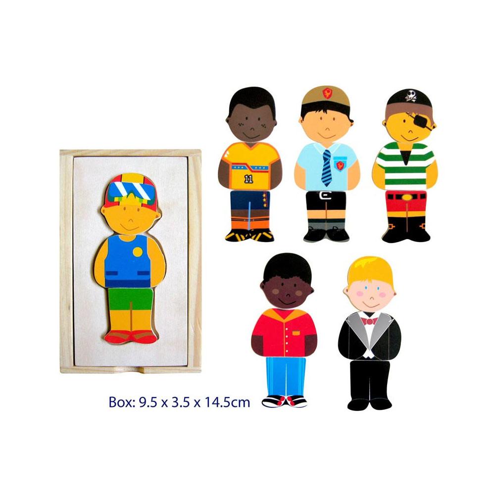 18 pieces are included in this cute dress up toy. Change the boys outfits and mix and match them to create wonderful images! Comes in a wooden case for easy storage.