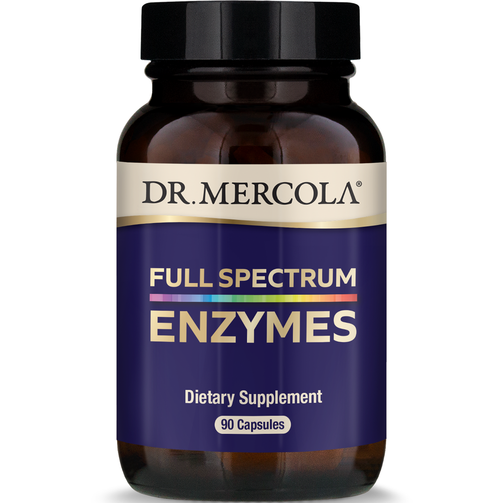 If you suffer with occasional bloating, gas, constipation, heartburn, upset stomach or other digestive concerns after eating, youre not alone. A national survey of 2,000 adults revealed that 74 percent of Americans live with these types of common digestive concerns. Digestive enzymes are essential for supplementing your bodys own enzyme production to help break down food molecules, and digest and absorb the nutrients in your food. Several factors decrease your own enzyme production, including aging. Dr. Mercola's Full Spectrum Enzymes is our one-of-a-kind flagship digestive enzyme blend. It is scientifically formulated based on USDA data to contain a broad range of enzymes to help digest different types of food.* The formula: Is designed for what real people actually eat, and includes an appropriate allowance for enzyme deficiencies and loss of enzymes due to age to ensure effective digestion without waste* Contains a total of 22 different digestive enzymes, including four special blends, to help completely digest carbohydrates, fats, proteins, fibers, and more* Works at a wide range of different pHs throughout your digestive tract to cover various phases of digestion, helping to digest food rapidly and relieve occasional bloating, gas, and intestinal discomfort* Is designed for speed to break down food fast and reduce digestive discomfort* Includes adenosine-5-triphosphate, or ATP, thats missing from processed and cooked foods to help initiate your digestive processes* Contains potent plant- , bacterial- and fungal-derived enzymes, instead of animal sources Contains no genetically engineered ingredients