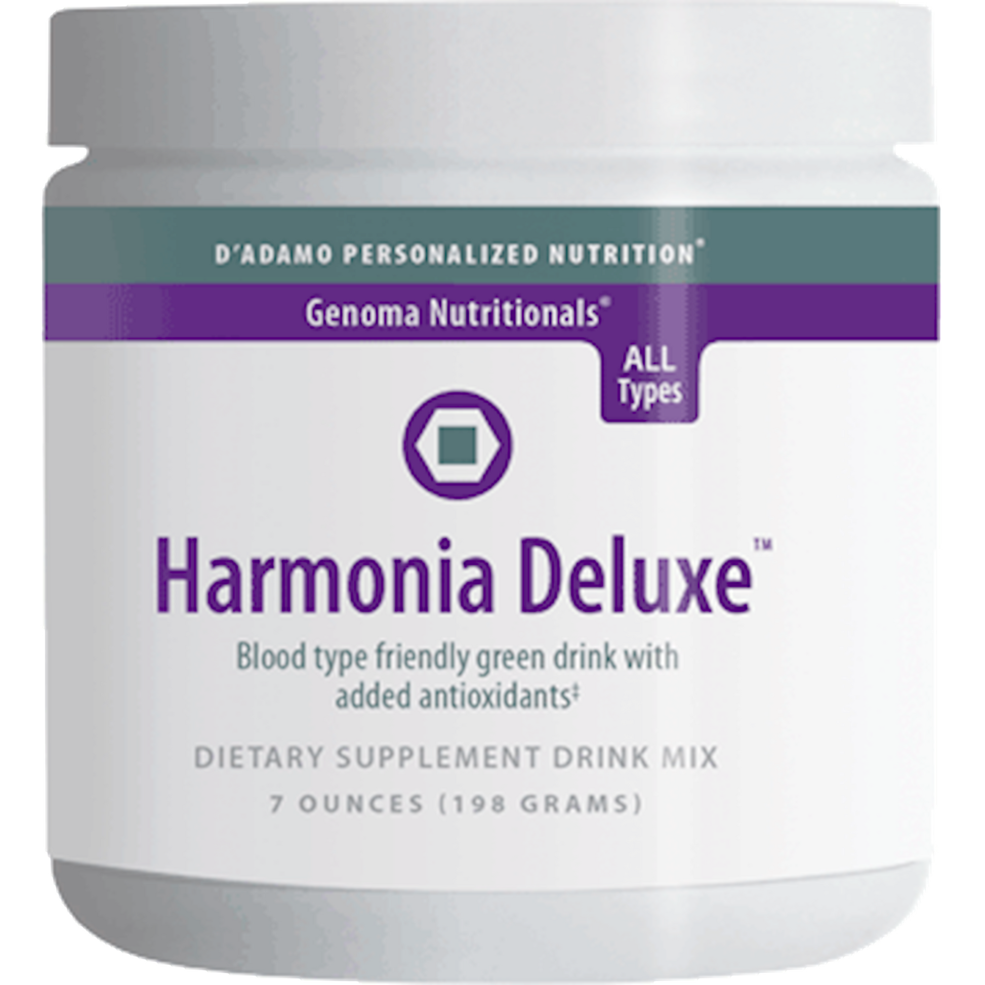 All-natural supplement drink mix made with sprouted seeds and other plant ingredients. Fresh greens and fruits. By the spoonful. When fresh, healthy greens and fruits arent available, D'Adamo's reformulated Harmonia Deluxe green drink mix can act as another all-natural way to incorporate fruits and vegetables into your daily routine. Dr. Peter D'Adamo, author of Eat Right 4 Your Type, specially developed this plant-based blend, which is right for all blood types. Now with a smoother consistency and containing a flavorful variety of ground sprouted seeds and grasses bursting with enzyme-rich nutrition, Harmonia Deluxe harnesses the power of the insoluble fiber found in plant-based greens to improve overall health. When mixed, tart cherries lend to a dark red hue, while the addition of more organic ingredients mean youre getting the healthiest green mix available. Simply blend Harmonia Deluxe into juice or beverage right for your type and enjoy. Ground to a fine green powder, Harmonia Deluxe includes all-natural plant-sourced ingredients: Organic Barley Grass: Supports the immune system by delivering powerful antioxidants and detoxifying nutrients. Naturally cleanses and supports healthy digestion.* Chlorella Algae: Loaded with protein, chlorella supports overall health by also providing vitamins, minerals and omega-3. Acts as a natural antioxidant and detoxifier while supporting the immune system.* Montmorency Tart Cherry Fruit: Supports healthy joint function and muscle recovery and can help to regulate sleep cycles. Nutrient-rich, tart cherry also delivers powerful antioxidants to support optimal health.* Works to support energy production* Aids in supporting vitality* Helps to maintain blood sugar levels already in the normal range*