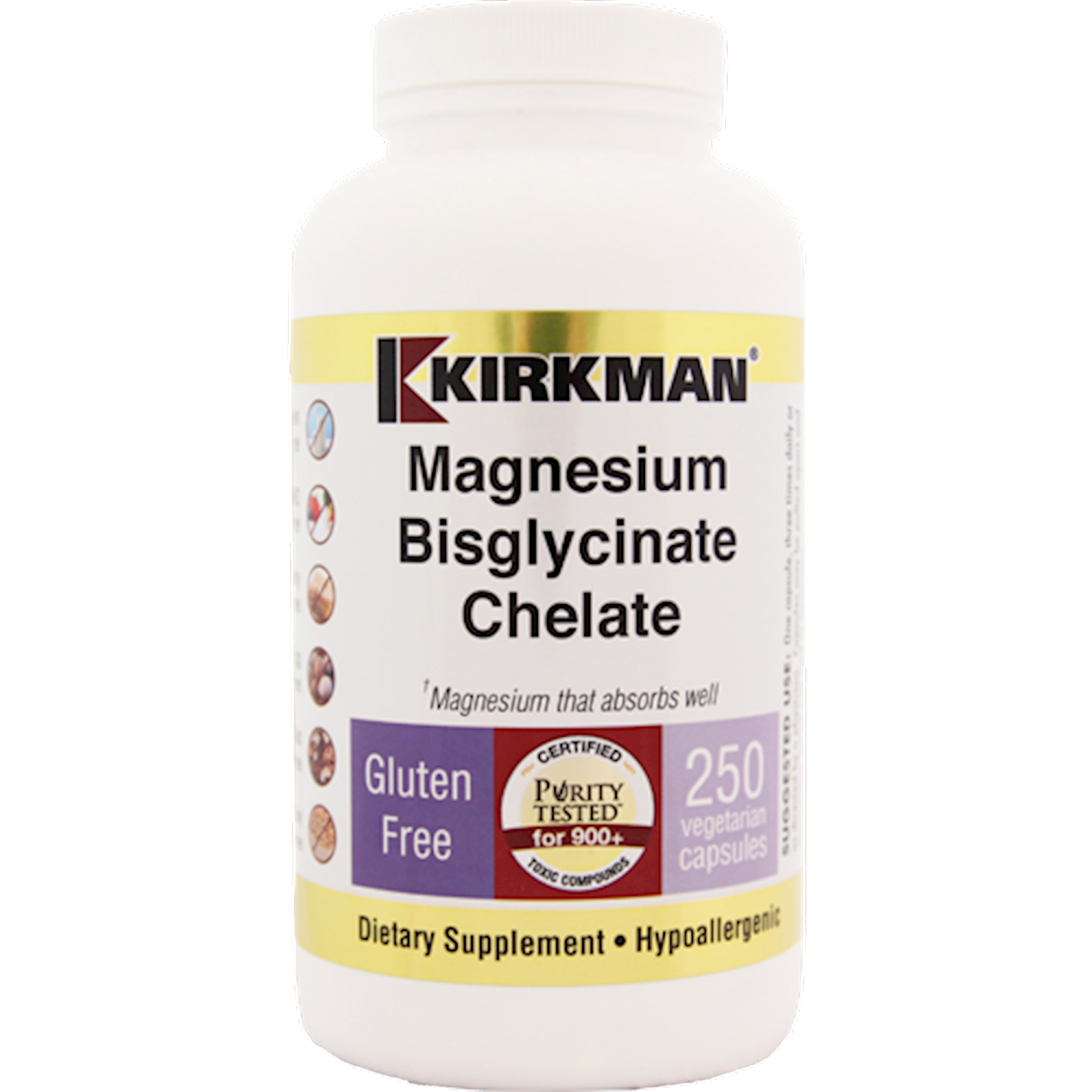 Relaxes nerves and muscles and promotes relaxation and restful sleep.* This product is part of our Bio-Max Series that uses forms of nutrients that have been clinically proven to be among the best absorbed and most highly bioavailable.* Gluten and casein free. Capsules are plant based. Ultra Tested. Magnesium is an essential mineral that is involved in many body functions as well as being a constituent of bones and teeth.* It is an essential element of cellular metabolism and is an enzyme activator.* Other body actions include: relaxing nerve impulses and muscle contractions;* promoting relaxation and contributing to restful sleep.* Signs and symptoms of low magnesium can include fatigue, mental confusion, irritability, weakness, muscle spasms, loss of appetite, difficulty sleeping or a feeling of weakness. The Physicians Desk Reference for Nutritional Supplements states that recent data of inpatient and outpatient populations suggests that magnesium deficits may exist in 12% to 40% of individuals. There are many different forms of magnesium, and no compelling data about absorption differences. However, there are reported differences in how different forms affect the gastrointestinal tract. Forms and functions of some of these include: Oxide: tends to firm stools in some individuals and loosen stools in others Glycinate: a very gentle form of magnesium that is easier on the system* Citrate: tends to loosen stools* Sulfate: tends to loosen stools* Chloride: tends to loosen stools.* Individual results may vary. Your physician should recommend the form thats right for you. Magnesium supplements usually have their beginning as minerals that have been influenced by our environment. For that reason, the purity of magnesium raw materials is important. Magnesium, like calcium, can have undesirable impurities present. Kirkmans magnesium is Ultra Tested, which means it is tested for more than 950 environmental contaminants, the highest standard of purity testing in the world.