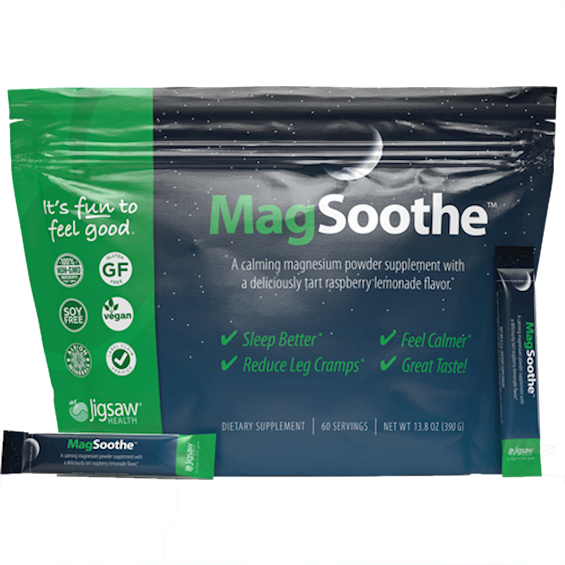 What is Jigsaw MagSoothe Tart Raspberry Lemonade A great-tasting, fast-acting, calming magnesium supplement powder utilizing the highly bioavailable Magnesium Lysinate Glycinate Chelate exclusively from Albion Labs, combined with bicarbonate.* What can MagSoothe Tart Raspberry Lemonade help me with* Promote healthy relaxed muscle tone and function* Promote athletic recovery* Support steady energy production Promote healthy, restful sleep* Support a balanced response to stress* Maintain healthy blood pressure levels within normal range* Maintain healthy blood sugar/glucose levels within normal limits* Promote regularity and healthy digestion* Support the body's ability to properly dissolve and utilize calcium in joints, muscles, and arteries* Support respiratory and cardiovascular health* Support healthy hormonal balanceespecially in connection with the female cycle* Support overall bone health* Why are Sodium Bicarbonate and Potassium Bicarbonate included Magnesium and bicarbonate work in tandem to enhance absorption and effectiveness of one another inside your body. What are the signs that the body is craving Magnesium When the body's magnesium stores are taxeda common occurrence considering our magnesium-poor dietsthe body provides some clear hints. Occasional body aches, constipation, tension headaches; reduced energy, interrupted sleep, and many other indicators are your body's way of telling you it needs more magnesium.* Magnesium is involved in more than 325 enzyme reactions. It's likely there are hundreds (thousands) more that scientists have yet to discover. Jigsaw MagSoothe (brand new!) is: Contains 200mg of Albion's Magnesium Lysinate Glycinate Chelate, a form of magnesium that generally has a calming effect Contains Magnesium co-factors Bicarbonate and Potassium Usually taken in evening Knowing that many people use magnesium malate in the morning, and magnesium glycinate in the evening, Jigsaw Health decided to create Jigsaw MagSoothe. They hope you enjoy this brand new magnesium product!