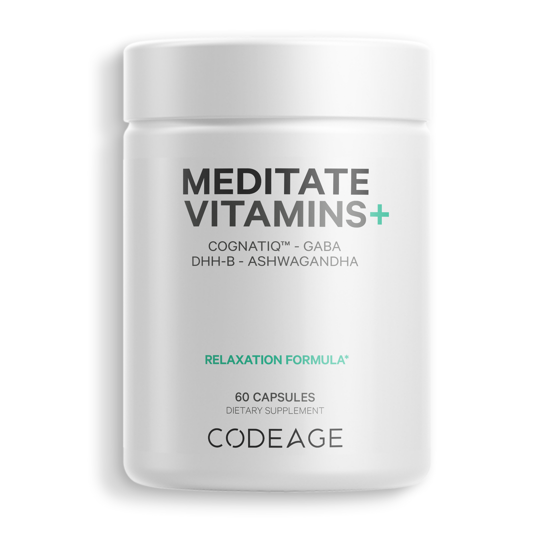 Codeage Meditate Vitamins+ is formulated to help promote relaxation, and support mental clarity, focus, and immunity.* With advanced ingredients such as CognatiQ™, DHH-B, GABA, ashwagandha, organic mushrooms, and blueberries, this supplement formula is designed for those seeking to help support their mental and physical well-being.*