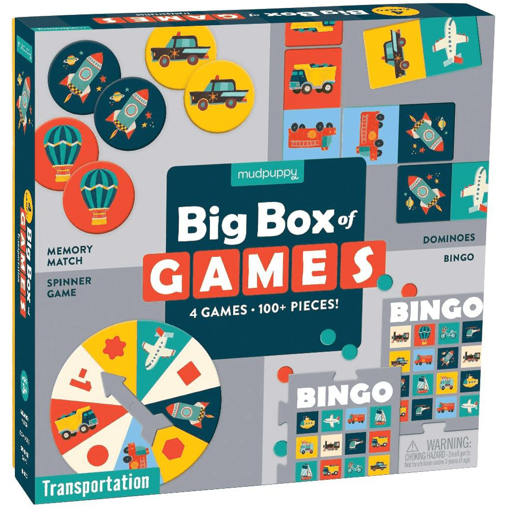 The Transportation Big Box of Games from Mudpuppy is jam-packed full of fun! Each box includes a memory game, dominoes, a spinner game, and bingo- all with art featuring modes of transportation.