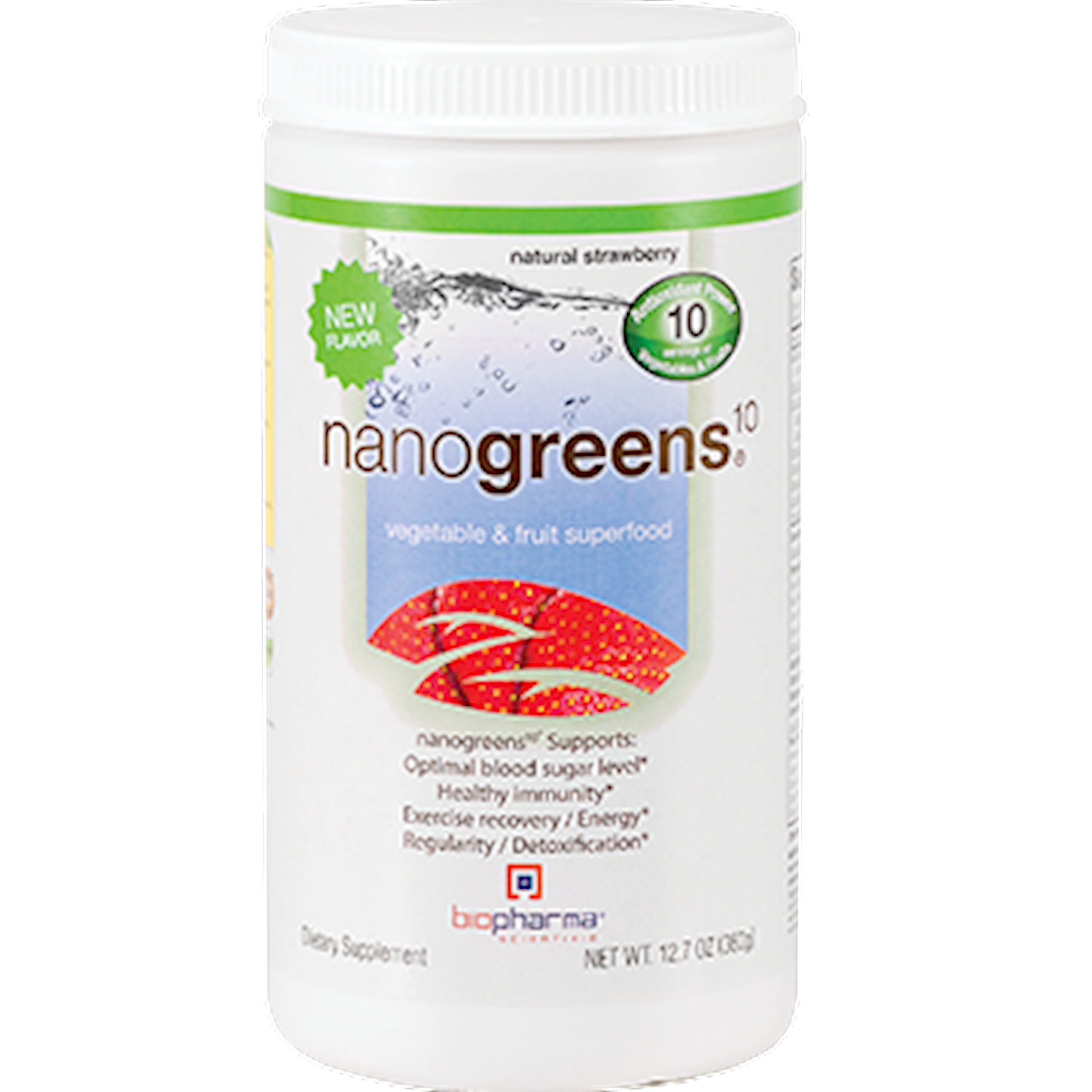 Vegetable and fruit superfood. Nanogreens Strawberry vegetable supplement is the perfect solution. In just one serving, you get the antioxidant power of 10 servings from 55 different ingredients. This green powder supplement is truly a powerhouse of nutrition and wellness, made easy. Do you eat the recommended 7-13 servings of fruits and vegetables per day Most of us would say no. Nanogreens supplies you with the antioxidant power of 10 servings of fruits and vegetables from a wide range of colors. It covers everything from those dark leafy greens to brightly colored fruits. Nanogreens is the only greens drink you will ever drink again! Science-based: It supports healthy blood sugar levels already in the normal range, healthy immunity, exercise recovery, and natural energy.* Nanogreens also supports cellular nourishment and protection, can assist your weight-management efforts and can help to maintain strong bones.* Enhanced bioavailability: All-natural, non-GMO, no added sugar, kid-friendly with Supersorb technology. Supersorb technology is liposomal encapsulation with the use of natural plant fats to surround key ingredients. Biopharma products stay protected while making their way through the harsh acidic environments of your stomach. This way, the nutrients have a clear pathway to make it to your small intestine where you absorb the most nutrients. Health benefits: The antioxidant power of 10 servings of fruits and vegetables from 55 different ingredients. The easiest way to get your dark leafy greens to be healthy and stay healthy.* The purest source: All Biopharma Scientific ingredients are sourced from the purest parts of the world. Places like New Zealand, Australia, France, Italy and Canada where the soil is nutrient-rich, organic and free of harmful substances. Biopharma doesn't add any fillers, preservatives, artificial sweeteners, additives or synthetic ingredients- just pure nutrients straight from mother nature. The antioxidant power of 10 servings of dark, leafy greens and brightly colored fruits 55 natural, organic, non-GMO ingredients (freeze dried to keep nutrients in) A complete formulation to combat free radicals* Refreshing strawberry flavor