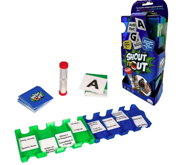 - UNLEASH YOUR VOCABULARY SKILLS IN AN EXCITING BATTLE OF WORDS: The package includes 20 category cards, 26 letter cards, 2 playing trays, and a 60-second timer. It's a fast-paced party game which the team or player who can generate the most words within the given time limit emerges as the winner of "Shout It Out," rewarding their quick thinking, vocabulary skills, and ability to work under pressure!
