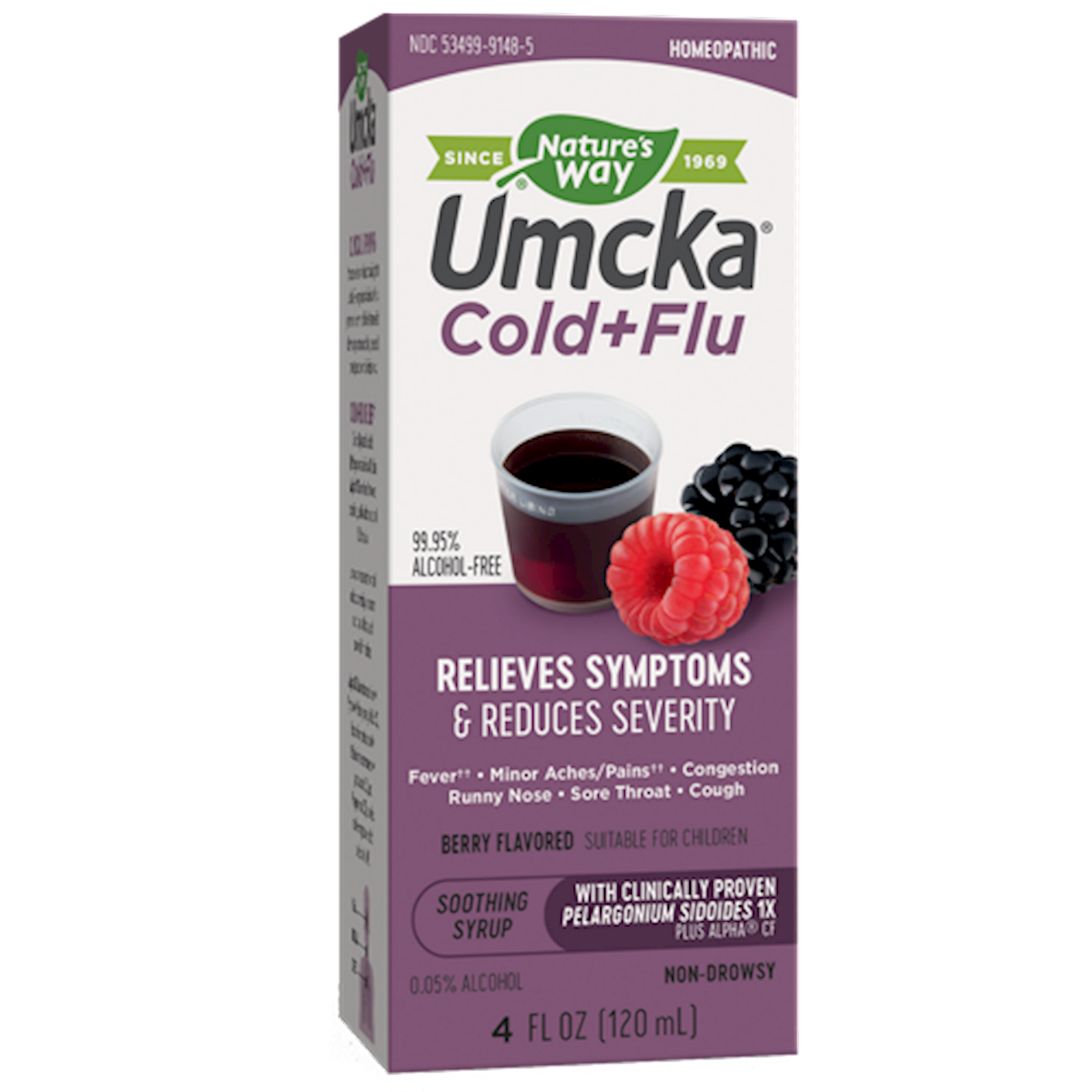 Homeopathic - Multi-action cold and flu formula Why Umcka Cold+Flu Sometimes youre not sure if its a cold or flu. Cold and flu symptoms can be so similar; it can be difficult to determine the cause of your discomfort. Umcka Cold+Flu formulas combines Umcka P. sidoides 1X plus Alpha CF blend to tackle both cold and flu.** Why Umcka Cold+Flu Berry Syrup Great Tasting, Non-Drowsy. Umcka Cold+Flu Berry Syrup combines Pelargonium sidoides 1X plus Alpha CF into one great-tasting, non-drowsy, multi-action cold and flu formula. This syrup is easy to take and suitable for children. Clinically tested Pelargonium sidoides 1X plus Alpha CF combined into one complete, multi-action cold and flu formula: Pelargonium sidoides 1X shortens duration and reduces severity of common cold, nasal, throat and bronchial irritations. Alpha CF (Aconitum napellus 4X, Eucalyptus globulus 2X, Bryonia 4X, Eupatorium perfoliatum 6X, Gelsemium sempervirens 4X, Phosphorus 6X and Ipecacuanha 3X) provides multi-symptom relief of colds and flu.**